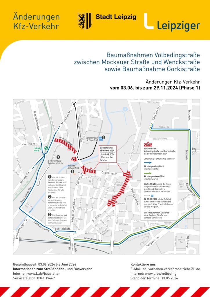 Die Absperrungen und Schilder stehen bereits, wer die Volbedingstraße lang gefahren ist. Ab dem 03.JUNI ist die Volbedingstraße zwischen Mockauer Straße und Friedrichshafner Straße bis Ende des Jahres gesperrt. Umleitung über die Friedrichshafner bzw. Adenauerallee und Rackwitzer Straße.