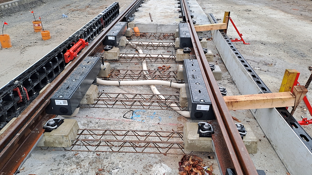 Die äußere Schiene ist verlegt und die Bordsteine werden gesetzt.