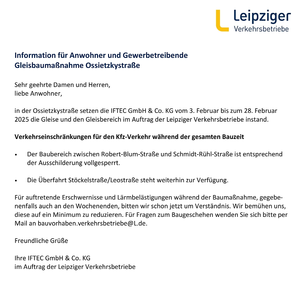 Wie die LVB / ITEC mitteilen, werden im gesamten Februar die Gleise / der Asphalt in den Gleisen in der Ossietzkystraße repariert / erneuert. Die Gleise und der Asphalt wurden zuletzt 2002 neu verlegt und zeigen nun ziemlich Verschleißerscheinungen.