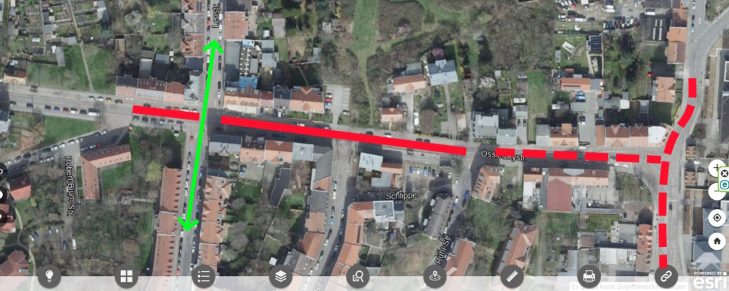 Die durchgehende Linie ist die neue Baumaßnahme. Die gestrichelte Linie die noch bestehende Baumaßnahme „Gorkistraße“. Der Teil der Ossietzkystraße am Rathaus wird im Rahmen des Umbaus der Kreuzung Zeumerstraße mit gemacht. Also im Frühjahr 2026, wenn der Plan bleibt.