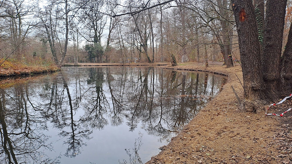 die Sanierung des Teiches im Abtnaundorfer Park ist abgeschlossen. Der Teich wurde entschlammt und auch das Ufer erhielt an einigen Stellen eine neue Kante.